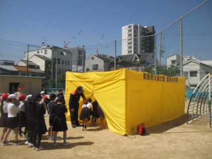 避難訓練をしている運動場の傍らに、なにやら黄色いテントのようなものが…