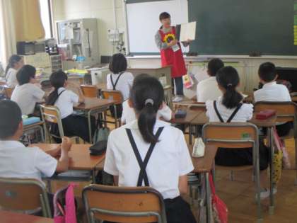 今日は6年生の2クラス、いつものようにおもむろに教室へ入るひまわりの先輩と、緊張の面持ちで教室へ入るタイミングをうかがう今年からひまわりに加わった後輩のコンビで読み語りをしていただきました。