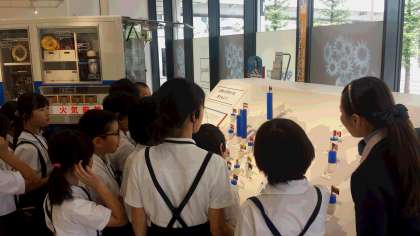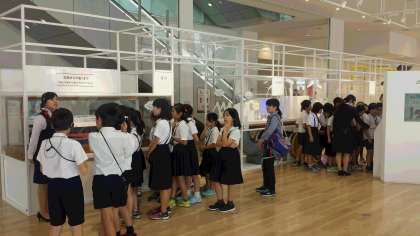 おはようございます。5年生は、今日、ハグミュージアムに来ています。今日は、ここで火おこしやエコクッキングを体験します。現地からの報告です。まずは、館内の見学からです。
