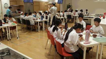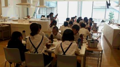 できあがりました。いただきま〜す!おいしい!ぼくは、野菜をきったよ。わたしは、炒めたよ。味噌汁の味は、バッチリ。みんなとてもいい笑顔です。