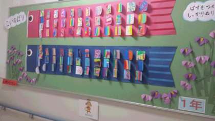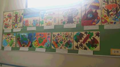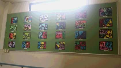 階段を上がると子どもたちの作品が展示してあります。学校にお越しの際には、子どもたちの力作をぜひご覧ください。