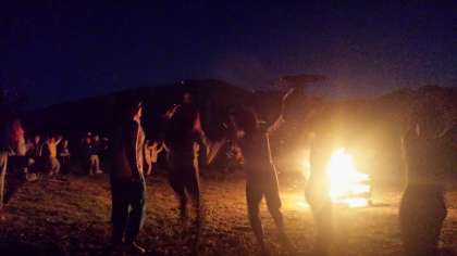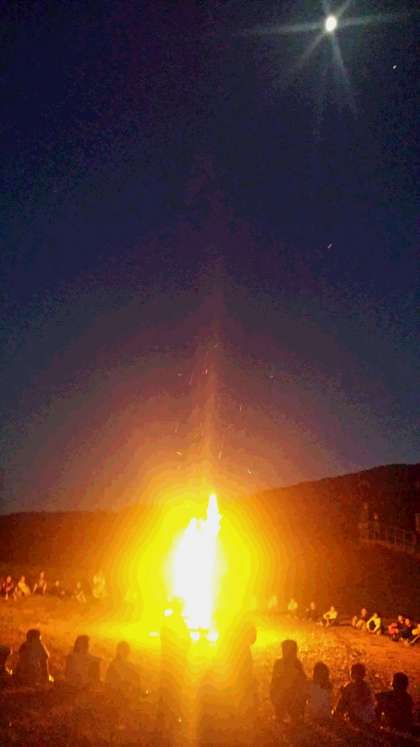 いよいよ待ちに待った、キャンプファイヤーです。火の神と妖精からいただいた火を囲んで歌やゲームやダンスを楽しみました。係りが考えたゲームも楽しかったけど、田村先生に教えてもらったおどりもすごく楽しかったです。終わりには、空一杯に広がる星と月を眺めて宿舎に戻りました。今日は、ぐっすり寝そうです。