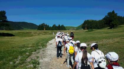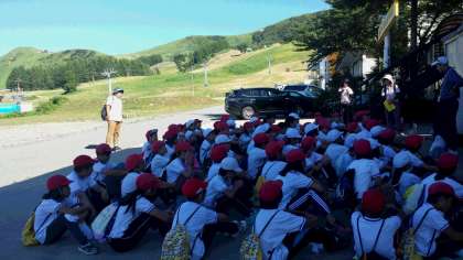本日の朝の行程は、山登りです。今年は、例年になく気温が高いため特に熱中症対策が必要です。そのため、当初予定していた鉢伏山から高丸山に変更しました。子どもたちは、とても元気で登る気満々ですが、日差しが強いこともあり予定を変更しました。しかし、高丸山からの眺めは、すばらしく山の緑と青空のコントラスト、そして、さわやかな風が最高です。濡らしたタオルを首にかけ、塩あめを舐めて行動するなどの熱中症対策を万全に出発します。