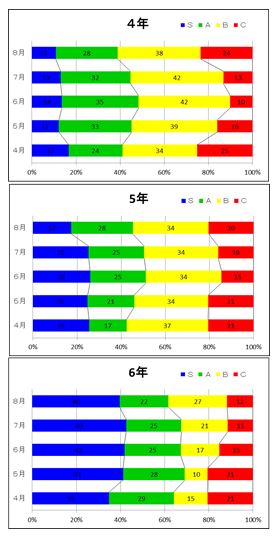 「7・8月家庭学習ばっちりカード」の集計ができました。夏休みが多くを占める月ですが、6年生は、1日の目標学習時間(70分)を超えている児童が60%以上になっています。自主学習ノートの提出も、のべ170冊に達し、家庭学習が定着してきている様子がわかります。