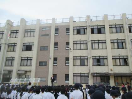 今日は、音楽鑑賞界の準備で講堂が使えないため、運動場で行いました。