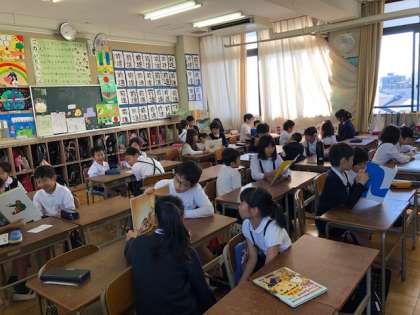 今日の読み聞かせ図書集会では、ペア学年の上の学年の子どもたちが、自分たちで選んだ本を下の学年の子どもたちに読み聞かせました。ていねいにわかりやすく読むすすめる上の学年の子どもたち。真剣に耳を傾ける下の学年の子どもたちの姿がとても印象的でした。教室中に温かい空気が流れていました。