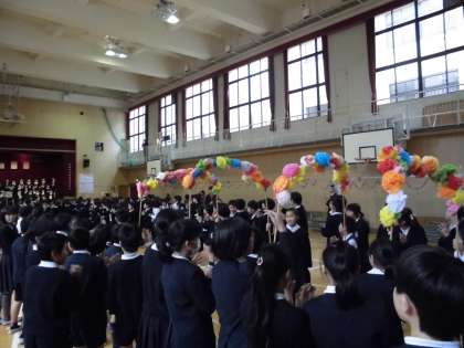 一年生から五年生までが先に講堂で準備をして、六年生を花のアーチと拍手で迎えます。