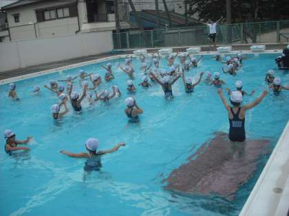 夏休み中のプール開放。暑さに負けず、プールの中でアヒル体操を元気いっぱい踊りました。