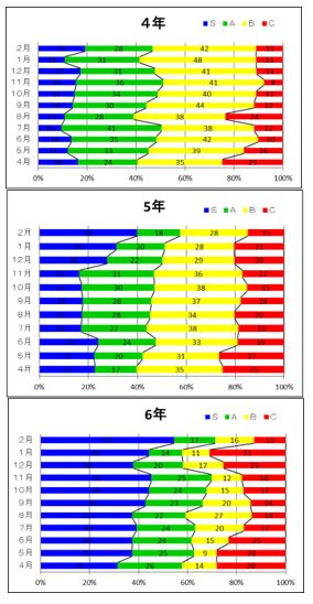 家庭学習ばっちりカード2月の結果が出ました。今回は、提出率が少し低かったですが、提出された子どもたちの様子を見ると、家庭学習の時間が増えてきていることがわかります。また、自学ノートは、昨年度の提出分を大きく上回っています。