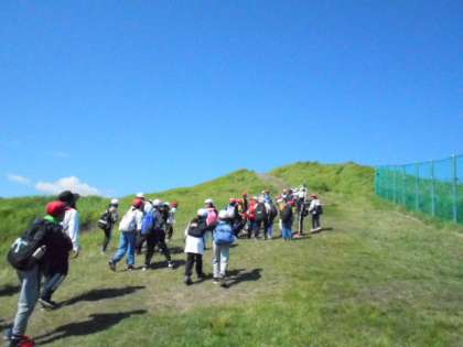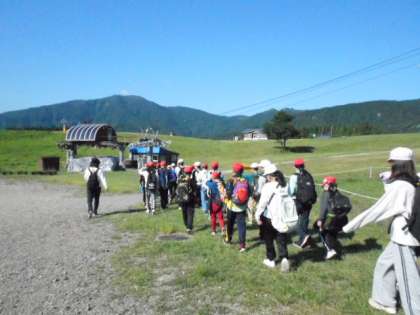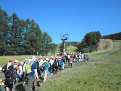 朝の高原らしい涼しい風の中、高丸山登山が始まりました。グループで励まし合いながら、頂上をめざします。