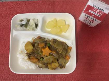 今日の給食は、「ビーフカレーライス・野菜のピクルス・りんご(カット缶)・牛乳」でした。