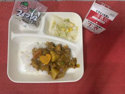 今日の給食は、「チキンカレーライス・キャベツとコーンのサラダ・ミニフィッシュ・牛乳」でした。