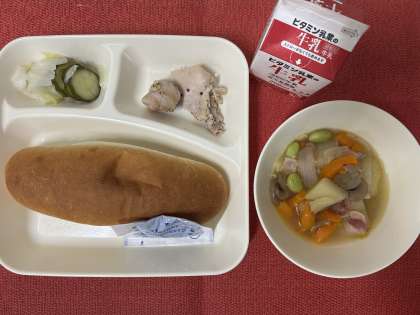今日の給食は、「鶏肉のバジル焼き・ベーコンと野菜のスープ煮・キャベツときゅうりのサラダ・コッペパン・ブルーベリージャム・牛乳」でした。