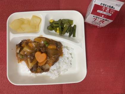 今日の給食は、「ハヤシライス・グリーンアスパラガスとコーンのサラダ・洋なし(カット缶)・牛乳」でした。