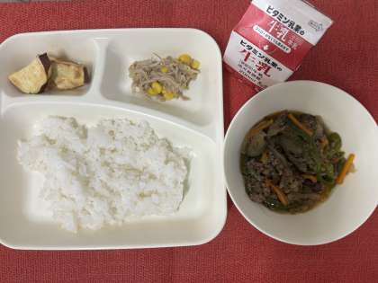 今日の給食は、「マーボーなす・ツナと野菜のいためもの・焼きさつまいもの甘みつかけ・ごはん・牛乳」でした。