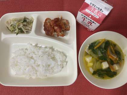 今日の給食は、「ヤンニョムチキン・とうふのスープ・切干しだいこんのナムル・ごはん・牛乳」でした。