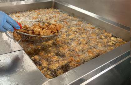 給食では、食中毒予防に中までしっかり火が通っているか、全献立を中心温度計で計測し確認しています。