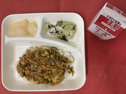 今日の給食は、「大豆入りキーマカレーライス・キャベツのひじきドレッシング・和なし(カット缶)・牛乳」でした。