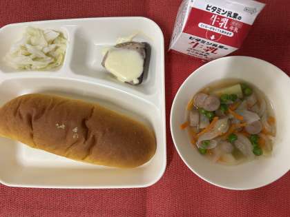 今日の給食は、「かつおのガーリックソースかけ・ウインナーとじゃがいものスープ・キャベツのサラダ・パンプキンパン・牛乳」でした。