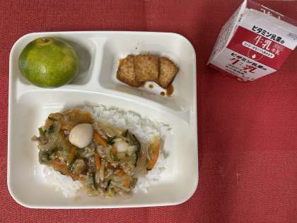 今日の給食は、「中華丼・あつあげの中華だれかけ・みかん・牛乳」でした。