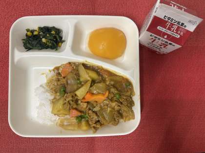今日の給食は、「ポークカレーライス・ほうれんそうのソテー・黄桃(缶)・牛乳」でした。