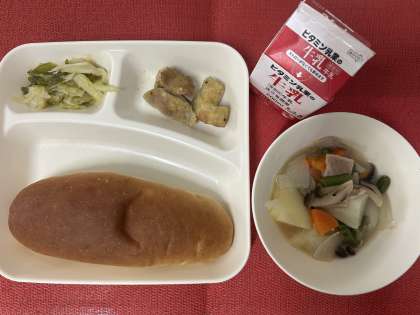 今日の給食は、「鶏肉のカレー風味焼き・スープ煮・野菜のソテー・黒糖パン・牛乳」でした。