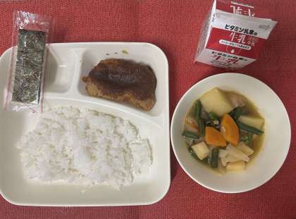 今日の給食は、「みそカツ・じゃがいもと野菜の煮もの・焼きのり・ごはん・牛乳」でした。