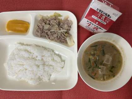 今日の給食は、「豚肉と野菜のいためもの・いわしのつみれ汁・かぼちゃういろう・ごはん・牛乳」でした。