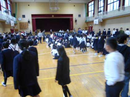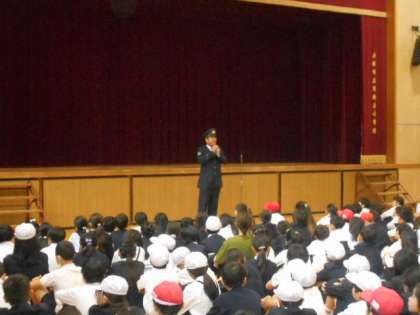 講堂に集合した後に、警察署の方から避難時に気を付けることなどを教えていただきました。