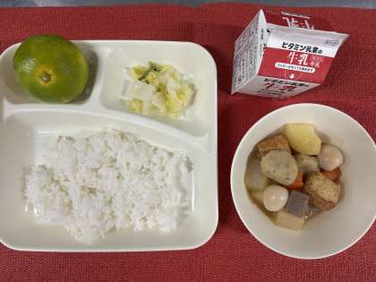 今日の給食は、「関東煮・はくさいの甘酢あえ・みかん・ごはん・牛乳」でした。