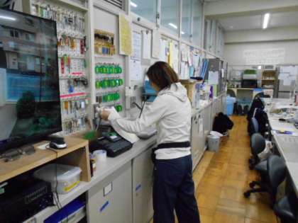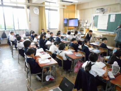 児童たちはそれぞれの教室で静かにお話を聞いていました。