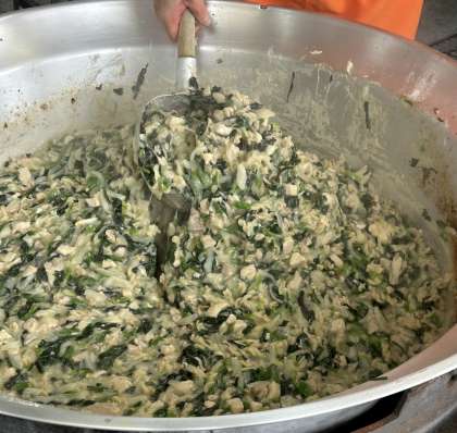 ほうれんそうのグラタンは、シチュールウの素で味つけし、上新粉でとろみをつけています。乳・小麦を使用していないので、乳・小麦アレルギーの児童も食べることができます。