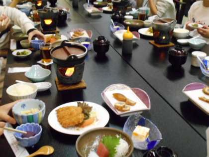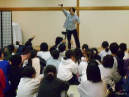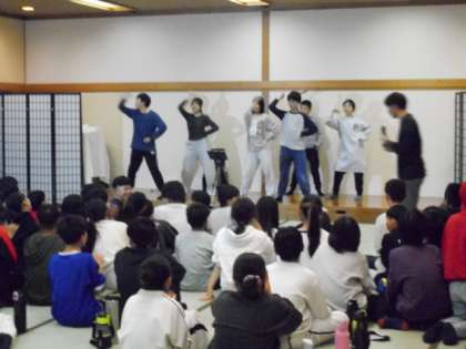 夕食後には、お楽しみ会。村主先生の歌を皮切りに、3組ダンサーズによる超高速・倍倍ファイトやカラオケ大会で盛り上がりました。