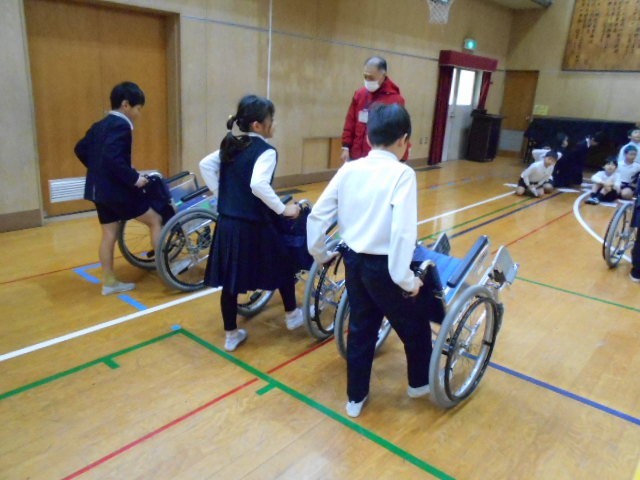 12月12日(金)に、3年生が車いす体験の活動をしました。リハビリテーションセンターのみなさんに、正しい車いすの扱い方を教えていただきました。
