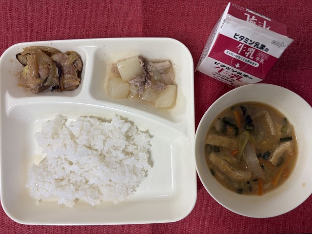 今日の給食は、「鶏肉の甘辛焼き・みそ汁・だいこんの煮もの・ごはん・牛乳」でした。