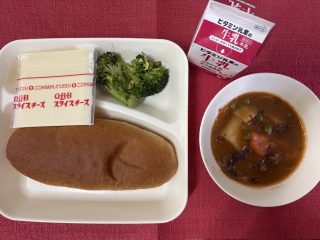 今日の給食は、「ビーフシチュー・ブロッコリーのサラダ・スライスチーズ・黒糖パン・牛乳」でした。