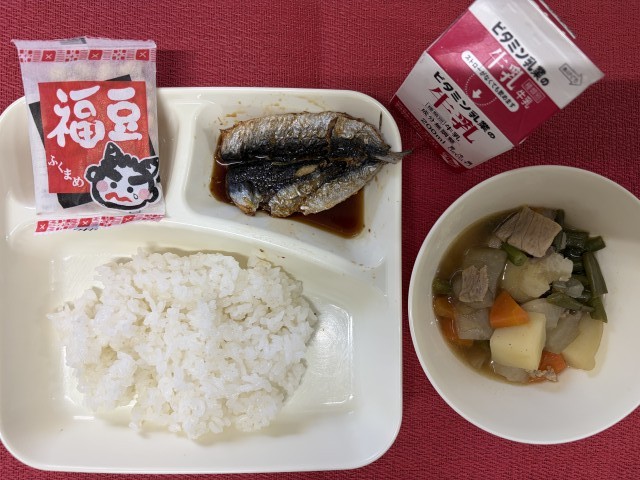 今日の給食は、節分の行事献立で「いわしのしょうがじょうゆかけ・含め煮・いり大豆・ごはん・牛乳」でした。