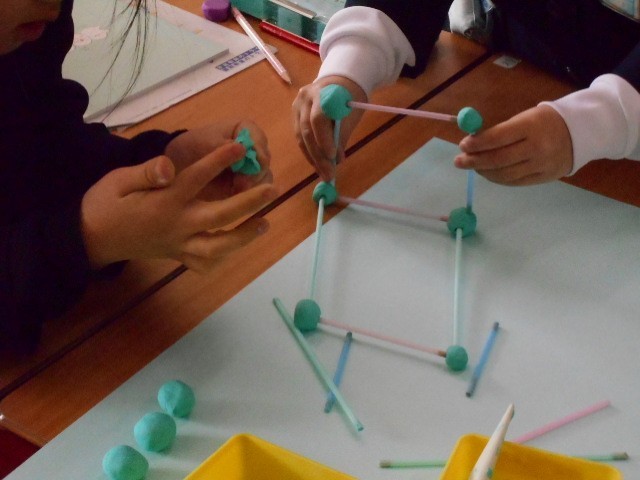 2年生では算数科で図形の学習うぃしています。立体の辺や面・頂点の数について学び、グループで協力してストローと粘土で実際に立体をつくってみました。