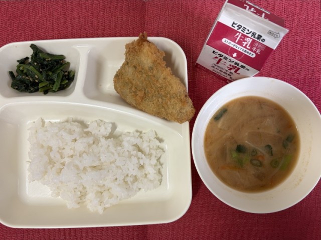 今日の給食は、「いわしフライ・みそ汁・ほうれんそうのごまあえ・ごはん・牛乳」でした。