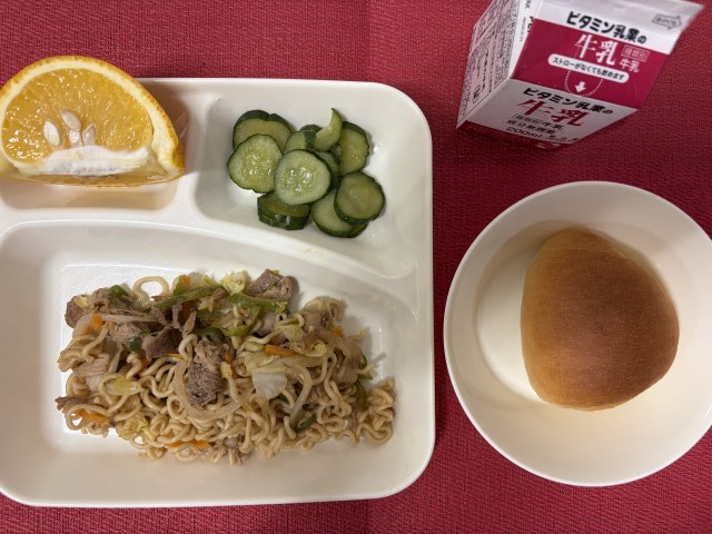 今日の給食は「焼きそば・きゅうりのしょうがづけ・あまなつかん・ミニコッペパン・牛乳」でした。