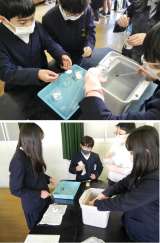 5年生が理科室で実験をしています。水の温度を、10度、30度、60度と変えてみ...
