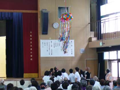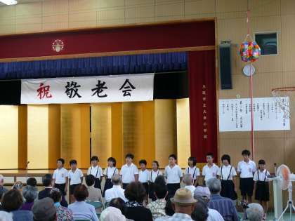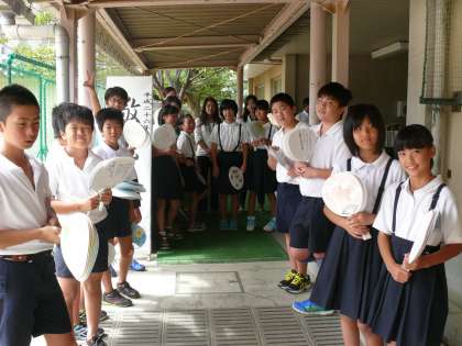 昨日の15日(月)に大東地域の敬老大会が開催されました。先日紹介しましたように子どもたちが手作りしたうちわを渡すために、児童会の人たちが来てくれました。