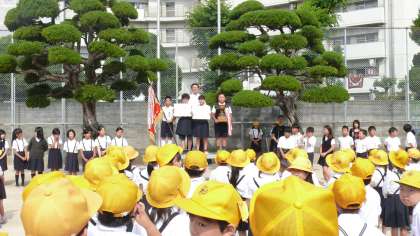 今日の児童朝会では、参加した選手みんなが前に出て、表彰されました。暑い中、よくがんばりましたね。