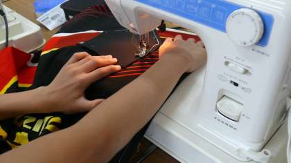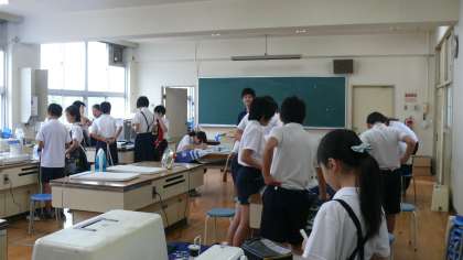 6年生は、家庭科の学習でエプロンを作っています。選んだ生地を裁ちばさみで切り、アイロンで折り目を付け、ミシンで縫っていきます。5年生で、ナップサックを作ったのでミシンは、1年ぶりです。作り方を確認し活動にはいりました。さすがに去年学習しているだけあって、作業はやいこと。また、友だちとの教え学習もばっちりです。
