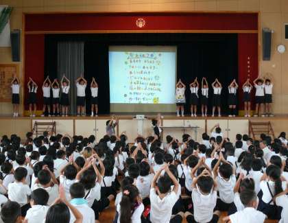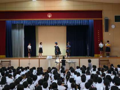 健康委員会の5・6年生が「正しい手の洗い方について」というテーマで発表を行いました。まず、「正しい手洗いの大切さ」を伝える劇で、見ている1〜6年生の興味をひきつけ、次に、視覚資料を使って説明を行い、そして、正しい手洗いの方法の歌をみんなで歌うことにより確認する、という流れのある実にすばらしい発表でした。見に来られた保護者を代表して、PTA役員の牛尾さん、金城さんからもお褒めの言葉をいただきました。
