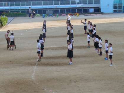 さて、休憩時間をうまく使って練習に励んでいる応援団ですが、ついにベールを脱ぐときが!? 運動場での練習が始まりました。周りで遊んでいる子たちも、自然と視線は応援団の方へ。私も見せてもらいましたが、短い時間の中で振付等も含めて、よく覚えたなあ! 太鼓の打ち方も、様になってるなあ、と思いました。欲を言えば、もう少し張りのある元気な声が・・・。でも、この応援団なら克服してくれるはず! 全体練習に向けて頑張ってくれることを願っています。