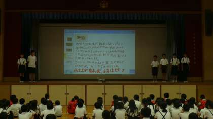 5年生は、総合的な学習の時間を使って、バケツ稲を育てています。子どもたちは毎日水の管理をし、愛情をもって育てています。今日の学年発表では、しっかりとお米を収穫できるように、よい土の条件や、水の量、容器の大きさなどを研究し、それぞれの班で研究した成果を発表しました。全校児童が楽しめるように、身振り手振りをつけて、場所にあった声の大きさで発表することができました。この研究成果をこれからの米作りにいかしていきます!