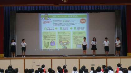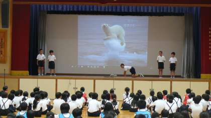 今日の児童集会で4年生は学年発表をしました。社会科の授業や体験学習、社会見学でごみについて学習しました。低学年には少し難しい内容だったかもしれませんが、写真やクイズを交えて発表することができました。とても短い練習時間でしたが、友だちと協力し、良い発表をすることができました。欠席した友だちのセリフを進んで発表していた姿には頼もしさを感じました。この調子で2学期の運動会に向けて絆を深めてほしいと思います。