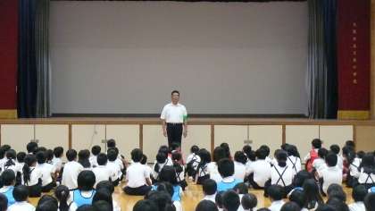 今週の児童集会は、4年生の学年発表でした。その発表、都島警察の方から夏休みのくらしについてお話をしていただきました。5つのきまりについてお話で、知らない人についていかない、帰る時間を伝えるなど、守ってほしいことをお話してくださいました。