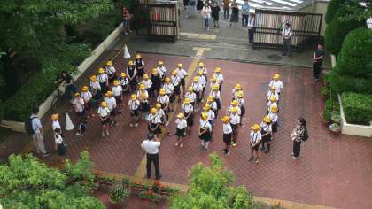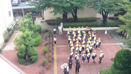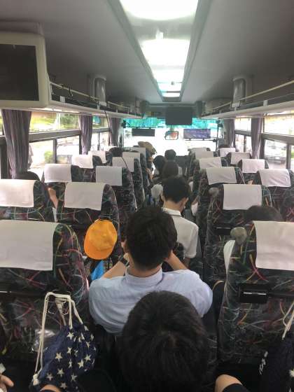 まだ梅雨明けがしていない中での林間学習のスタートとなりました。お天気が心配されますが、玄関前で出発式を行い、そのあとバスへと乗り込みました。